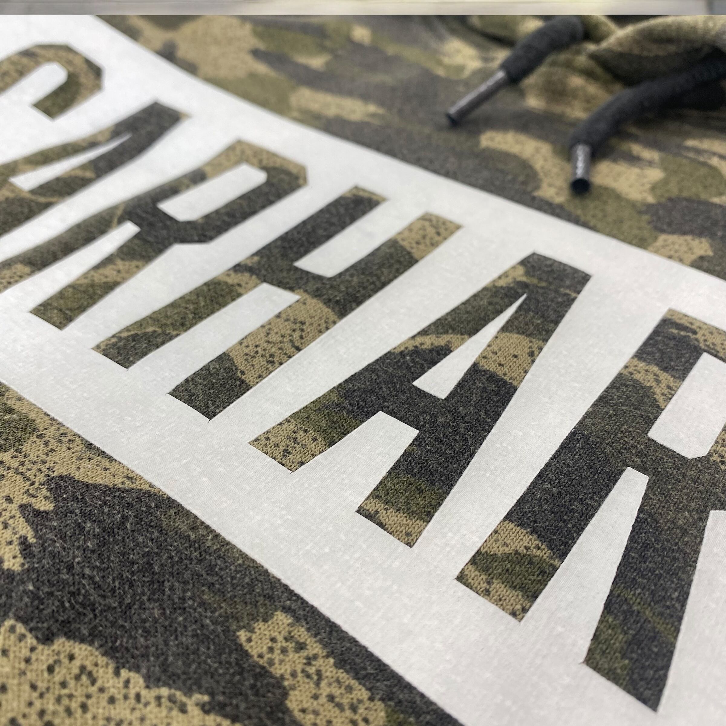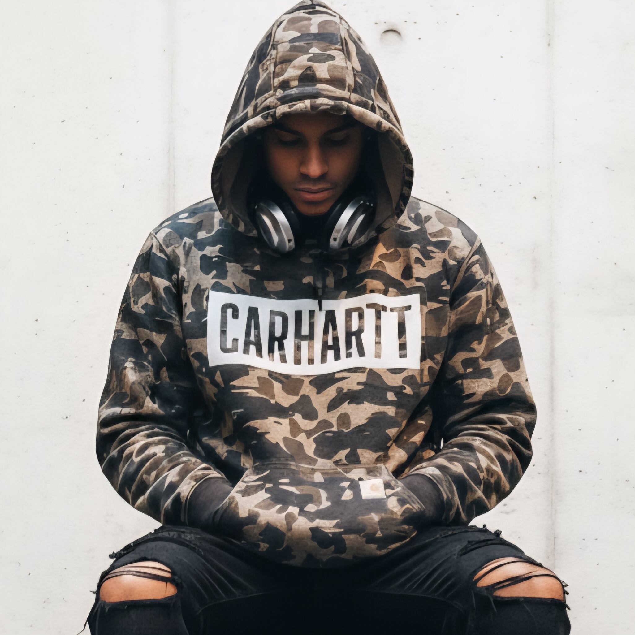 全体に迷彩柄をあしらったミリタリーテイストのデザインに、胸元の大きな「CARHARTT」の