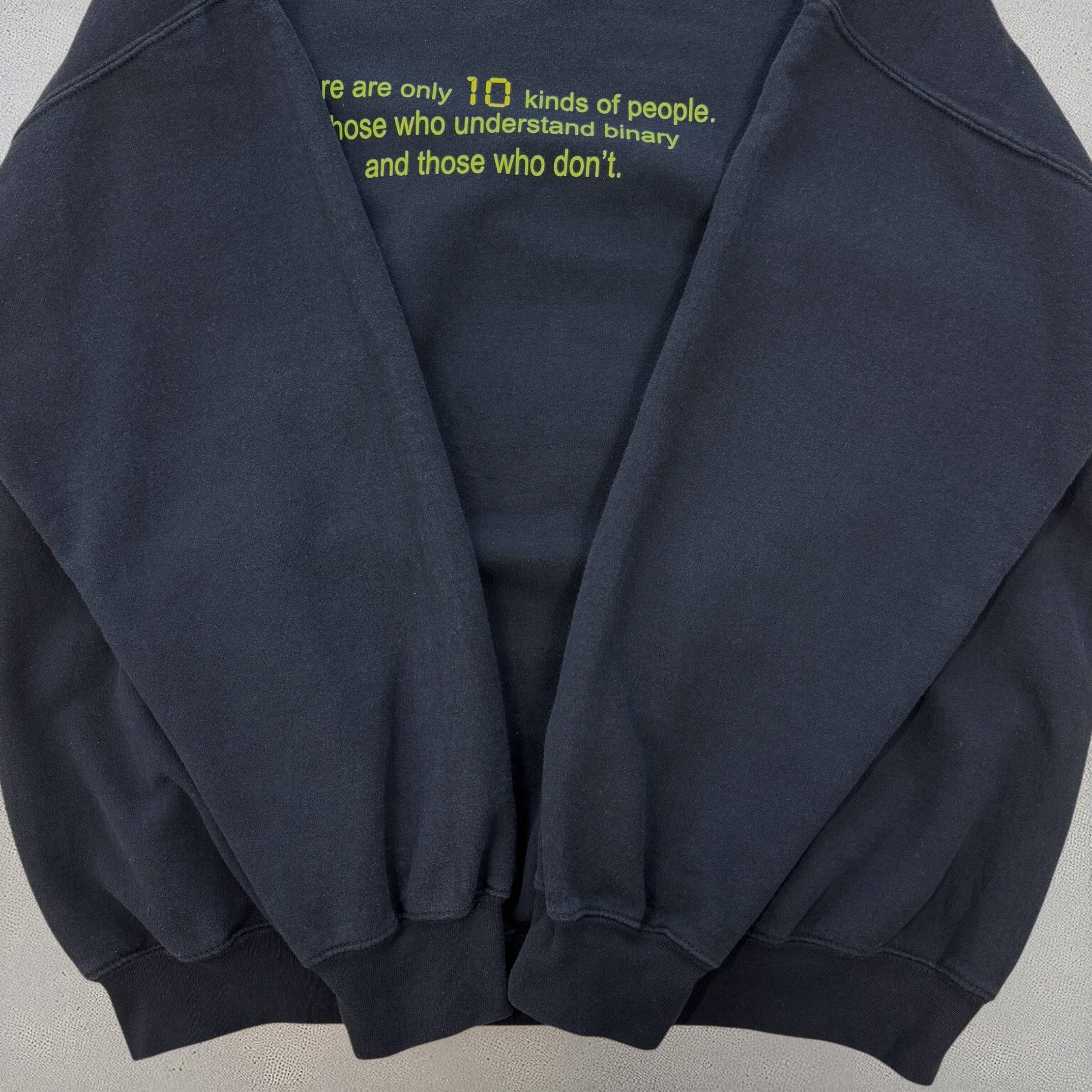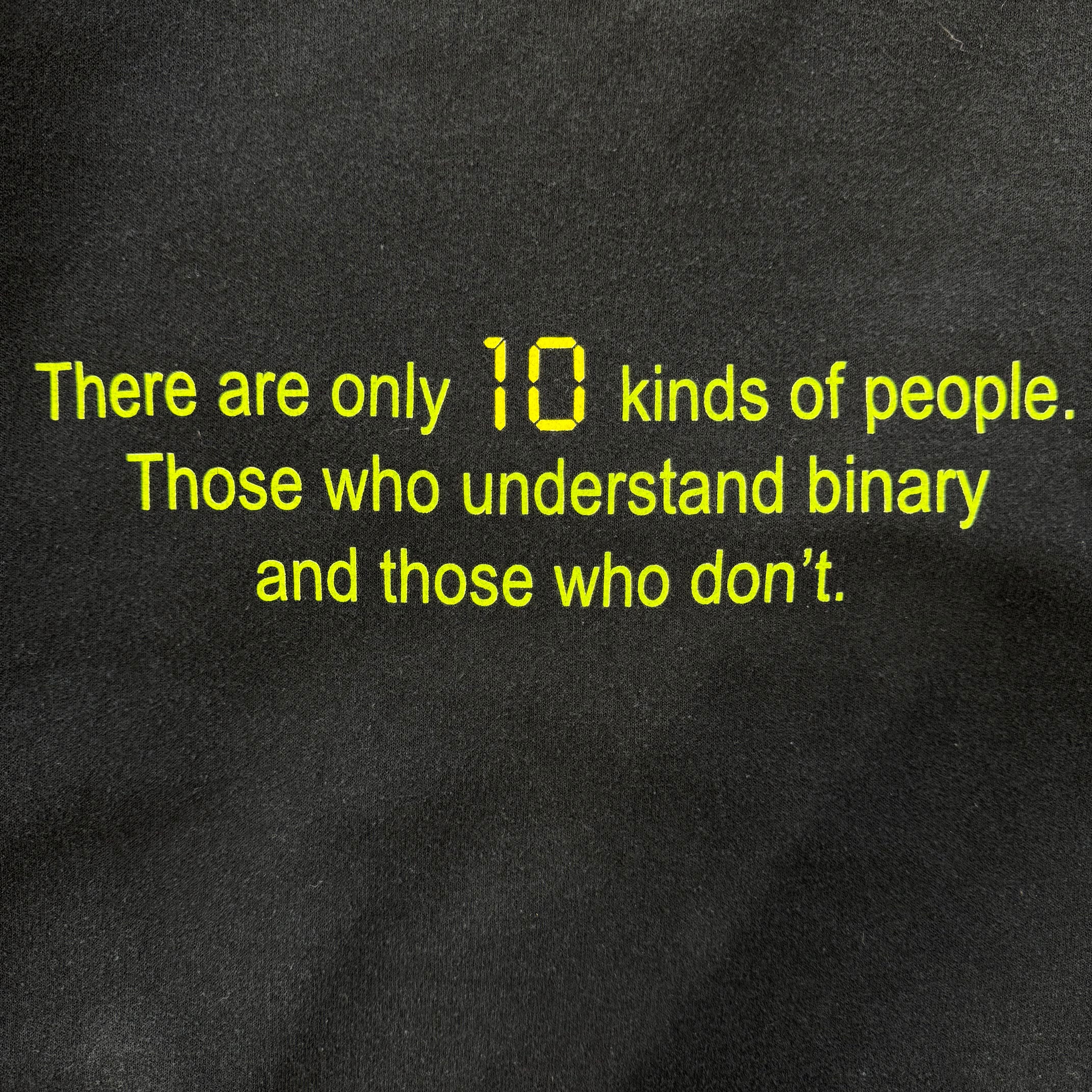 「10」は2進数で「2」を意味しており、このジョークが成り立つのは2進数を理解している人のみという、知的なユーモアが効いたデザインです。ゆったりとしたXLサイズで、性別を問わず着用いただけます。