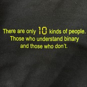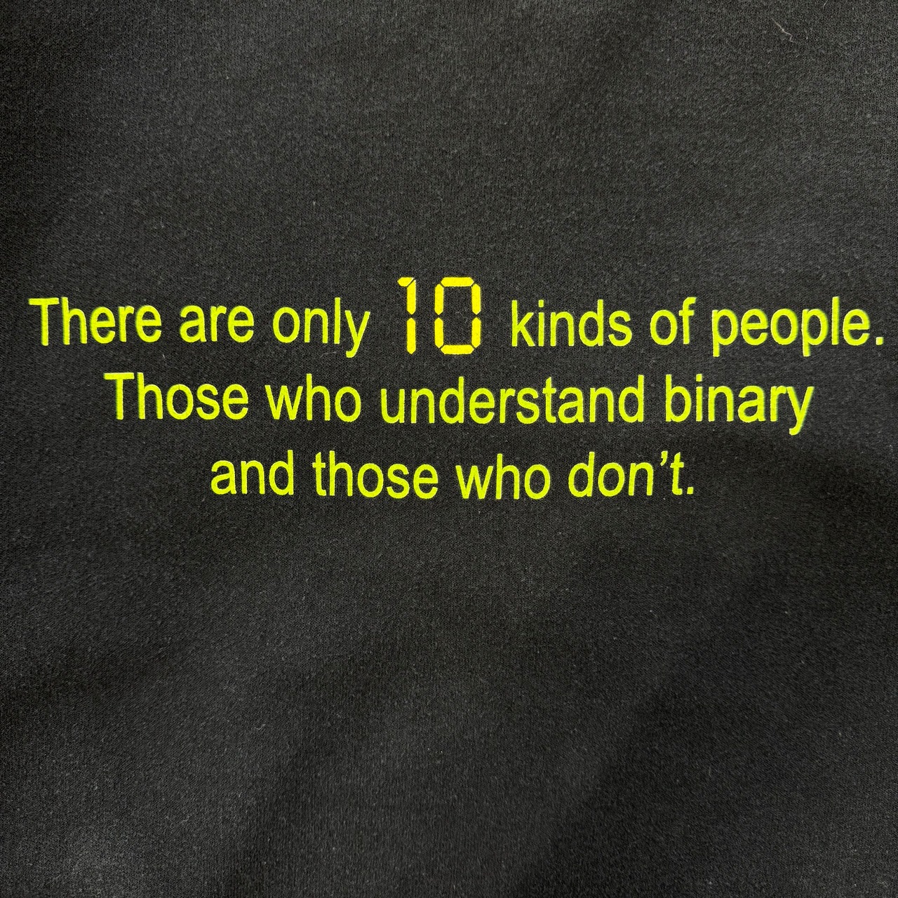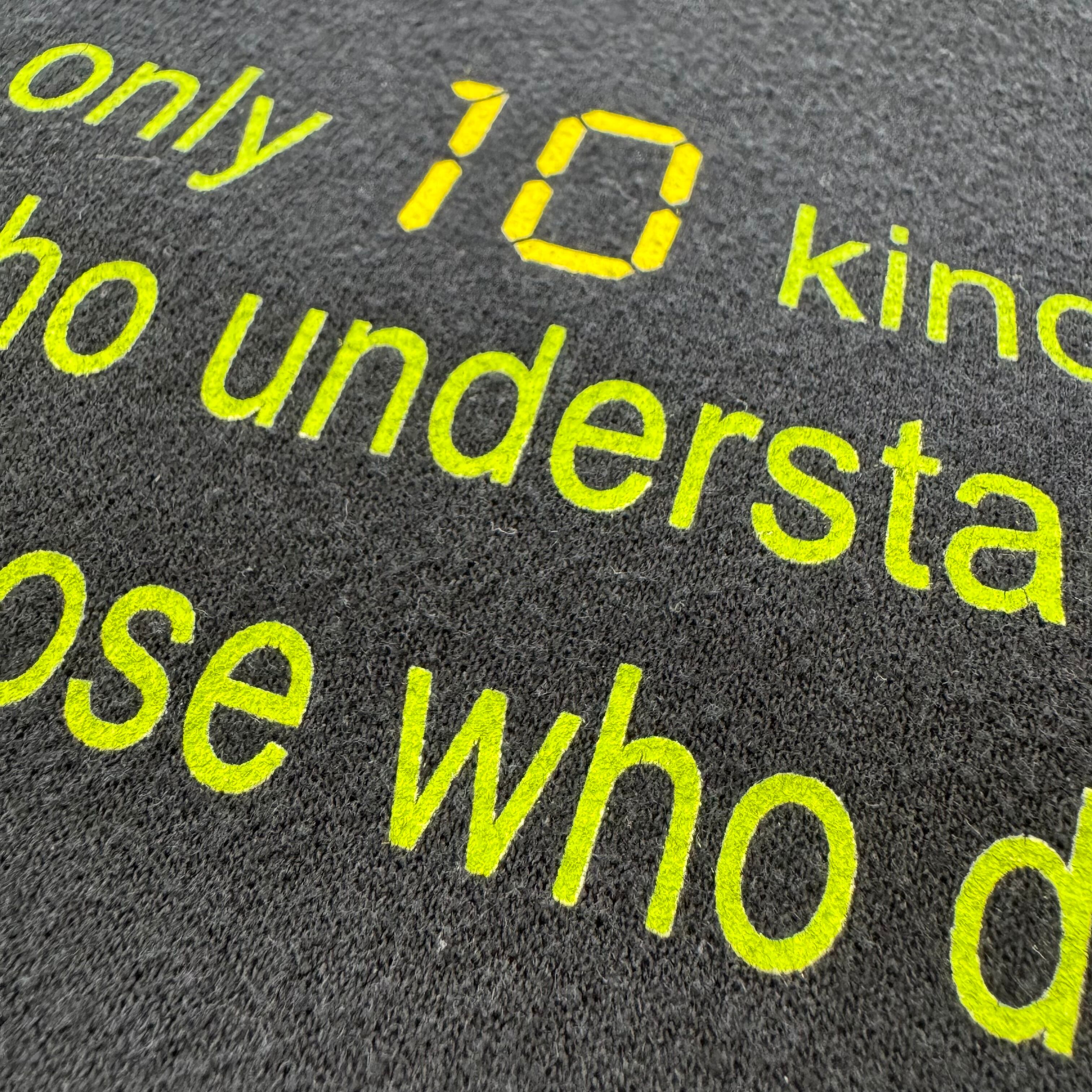 「There are only 10 kinds of people. Those who understand binary and those who don't.」(世の中には10種類の人間しかいない。2進数を理解できる人間と、そうでない人間だ。)という、プログラマーやITエンジニアの間で有名なジョークがプリントされています。
