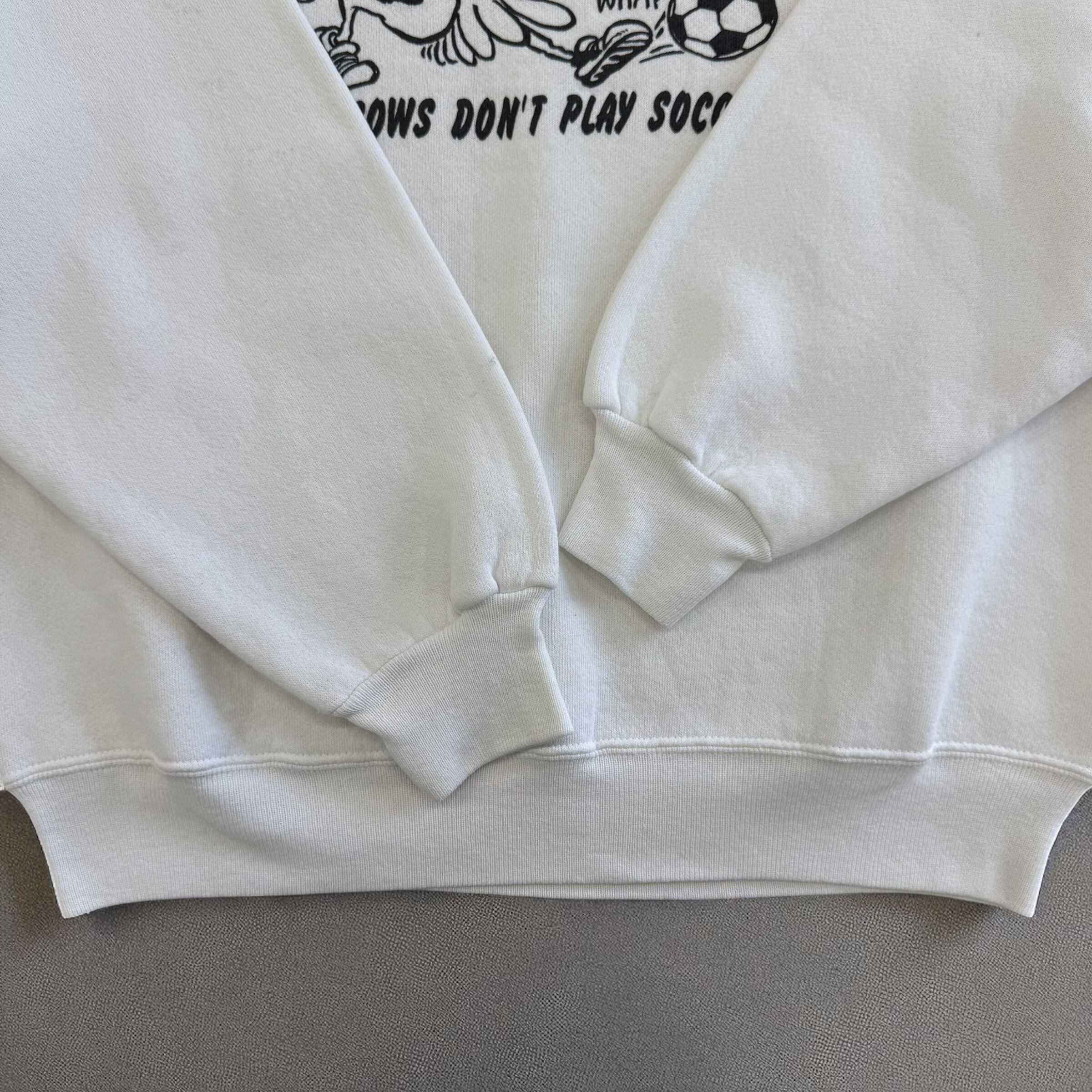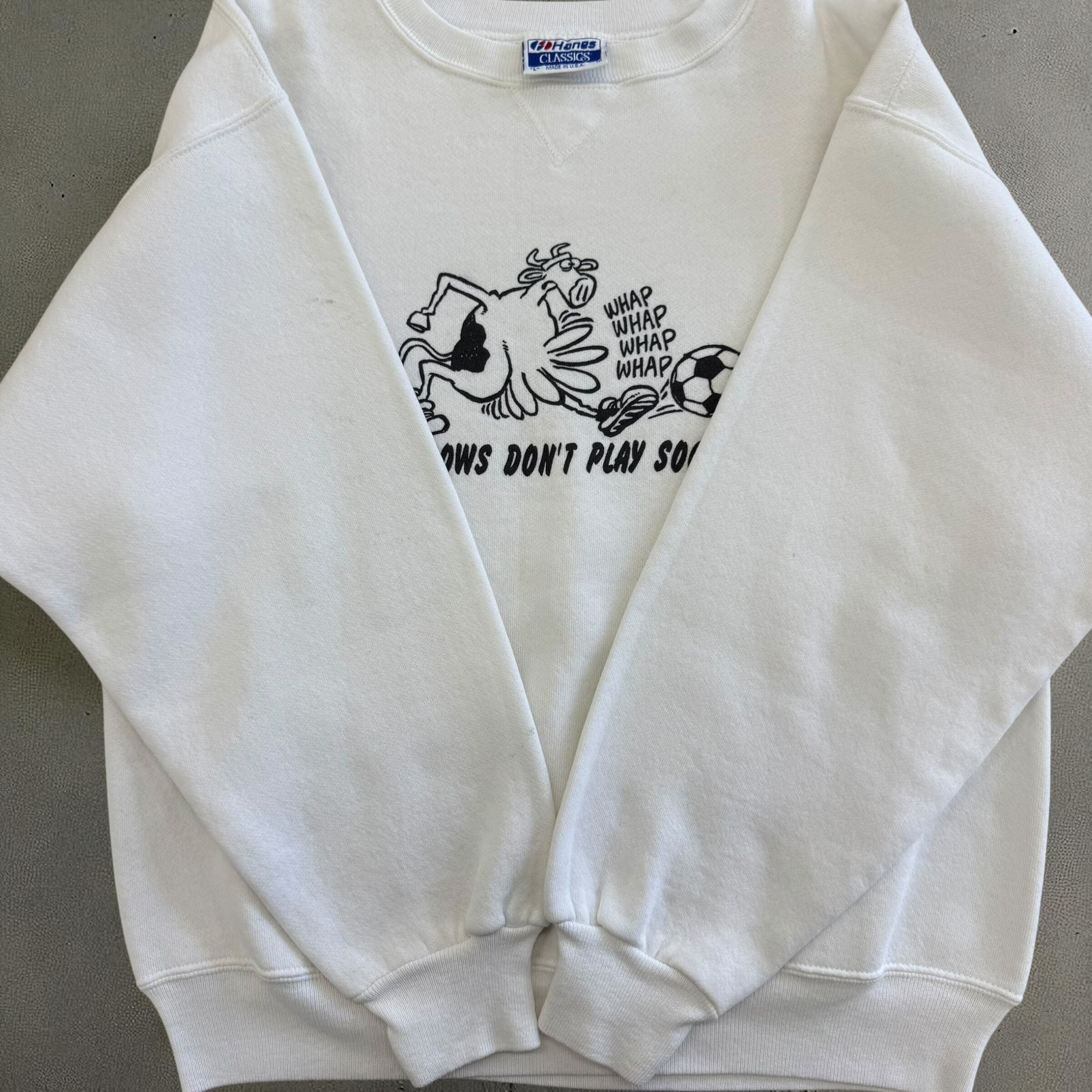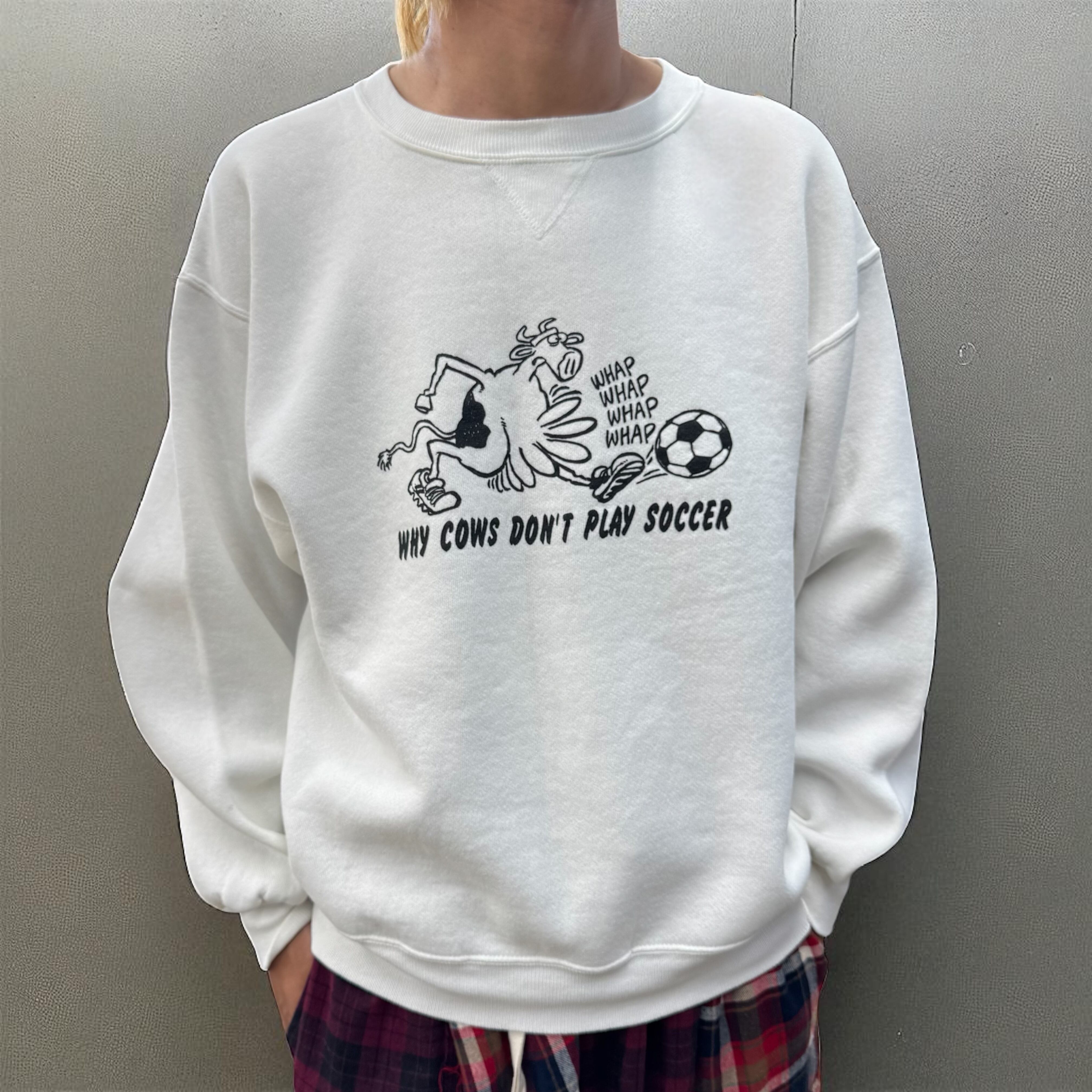 USA製 Hanes WHY COWS DON'T PLAY SOCCER プリントスウェット 白 Lサイズ