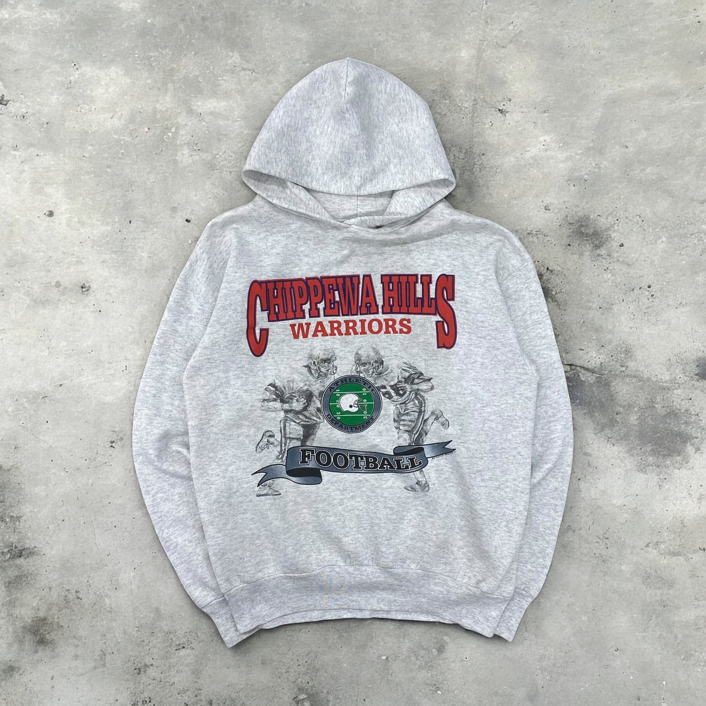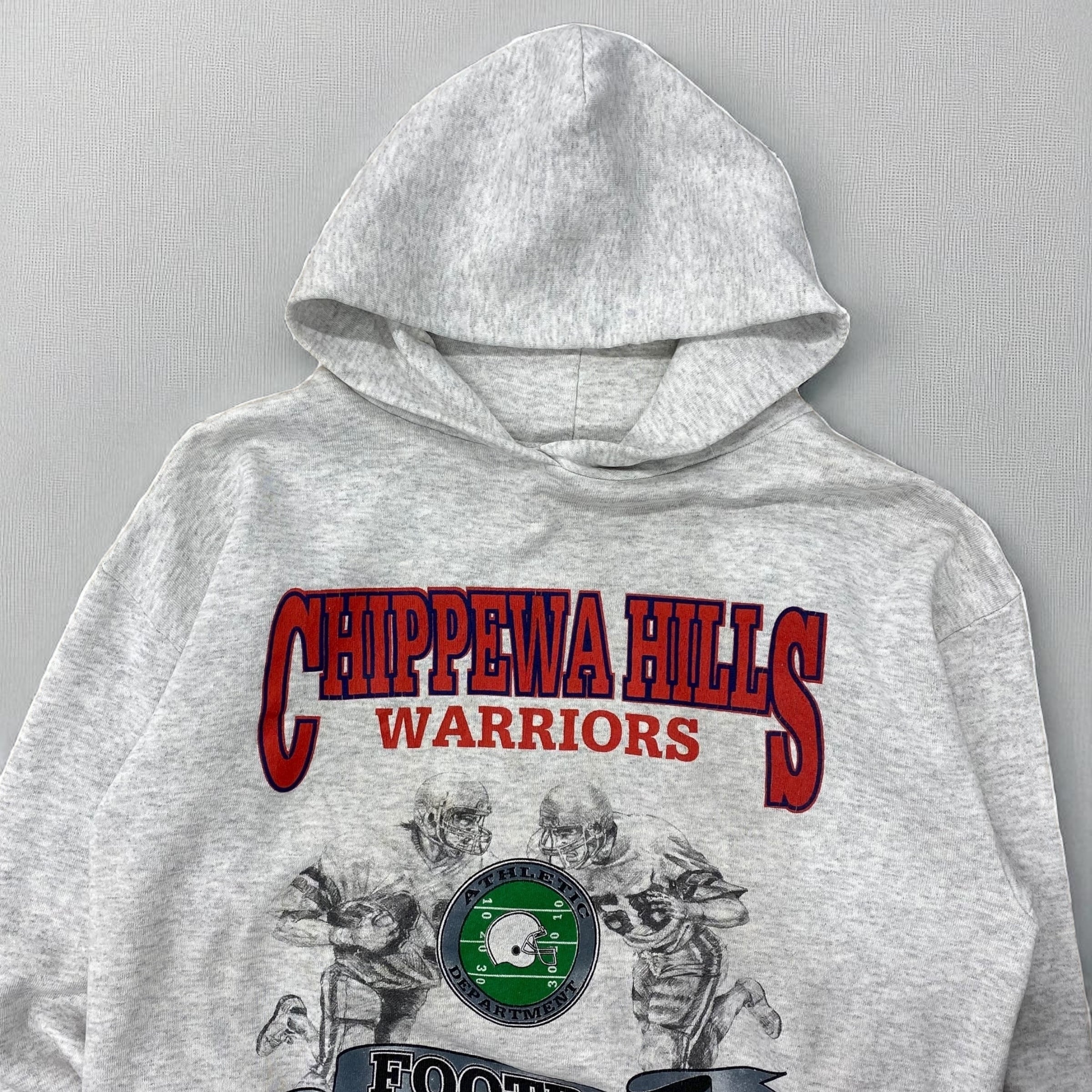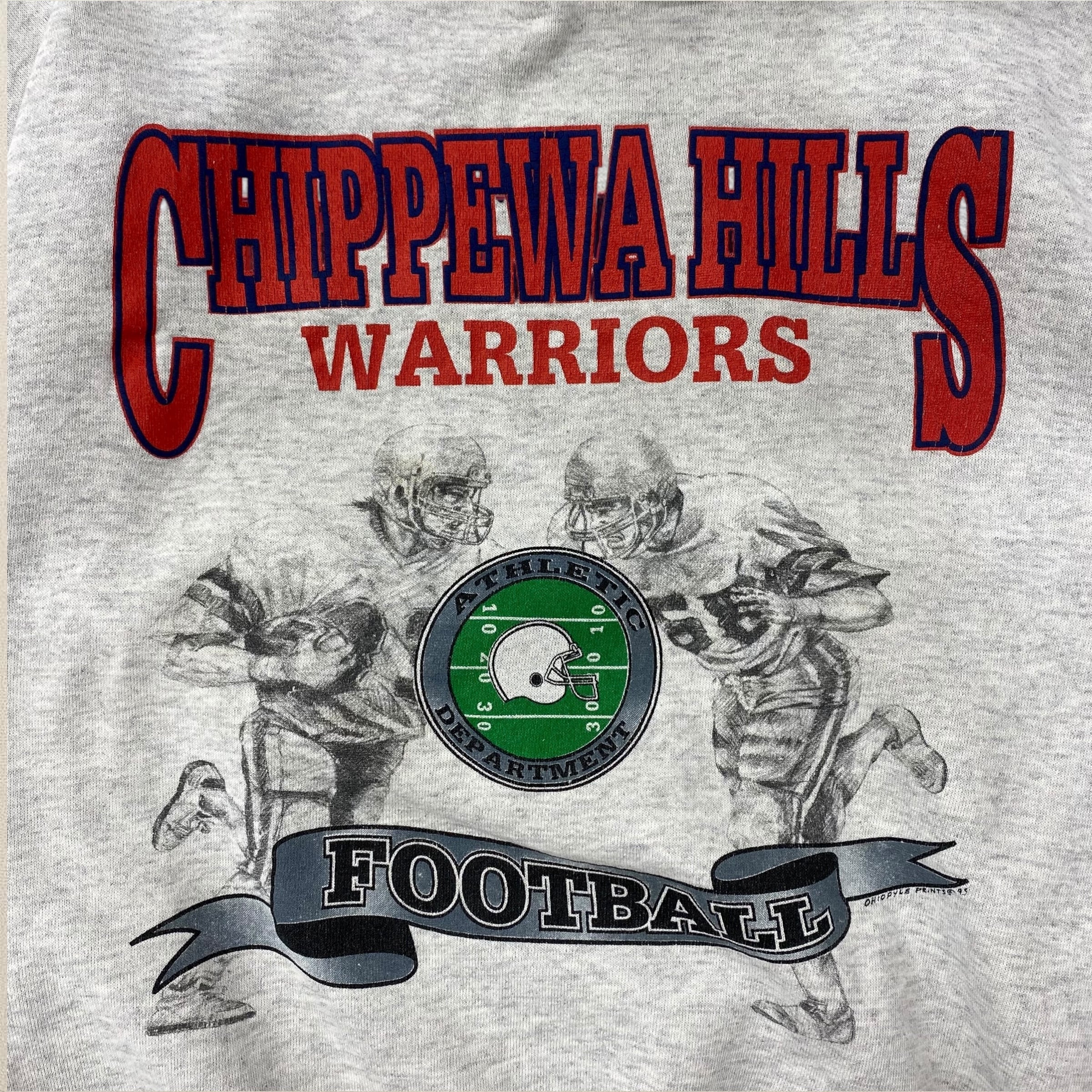 フロントには**「CHIPPEWA HILLS WARRIORS FOOTBALL」**のロゴと、迫力あるフットボール選手のグラフィックが大胆に描かれており、カレッジ(またはハイスクール)スポーツものらしい、存在感のあるデザインが魅力です。