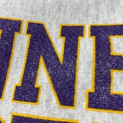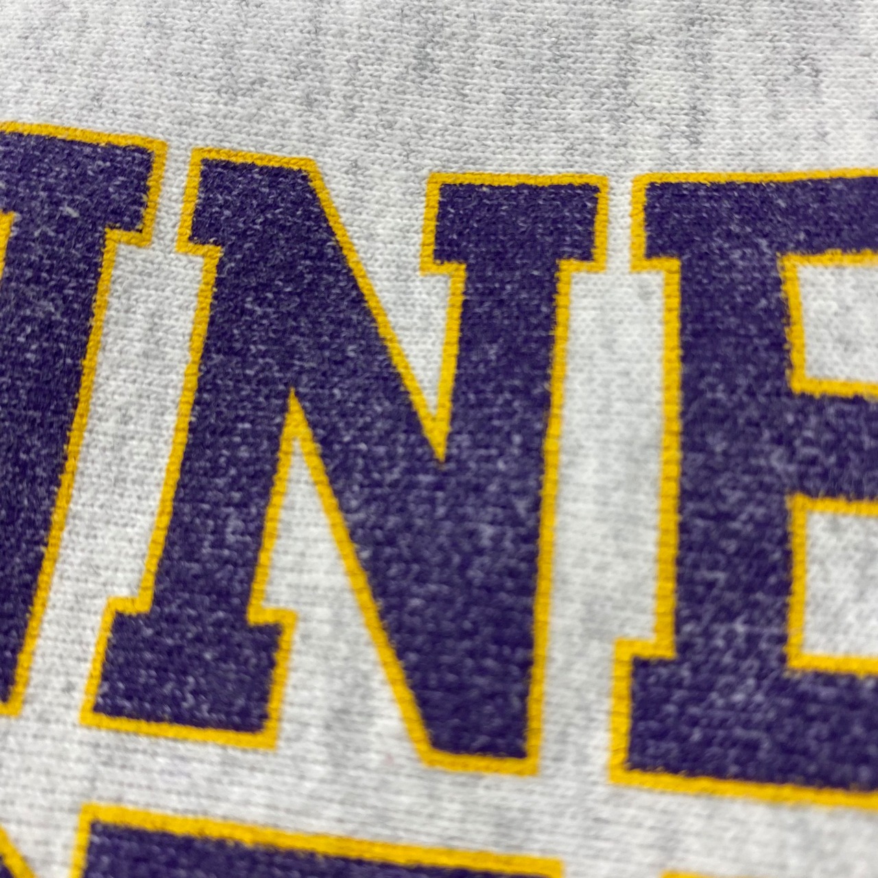 こちらはエルサルバドル製で、現行品に近いモデルですが、しっかりとした作り込みが魅力です。ボディは定番のヘザーグレーで、フロントには**「MINNESOTA STATE MANKATO(ミネソタ州立マンカト)」のカレッジロゴが、パープルとイエロー**の2段でラバープリント(またはフロッキープリント)されており、インパクトのあるデザインです。