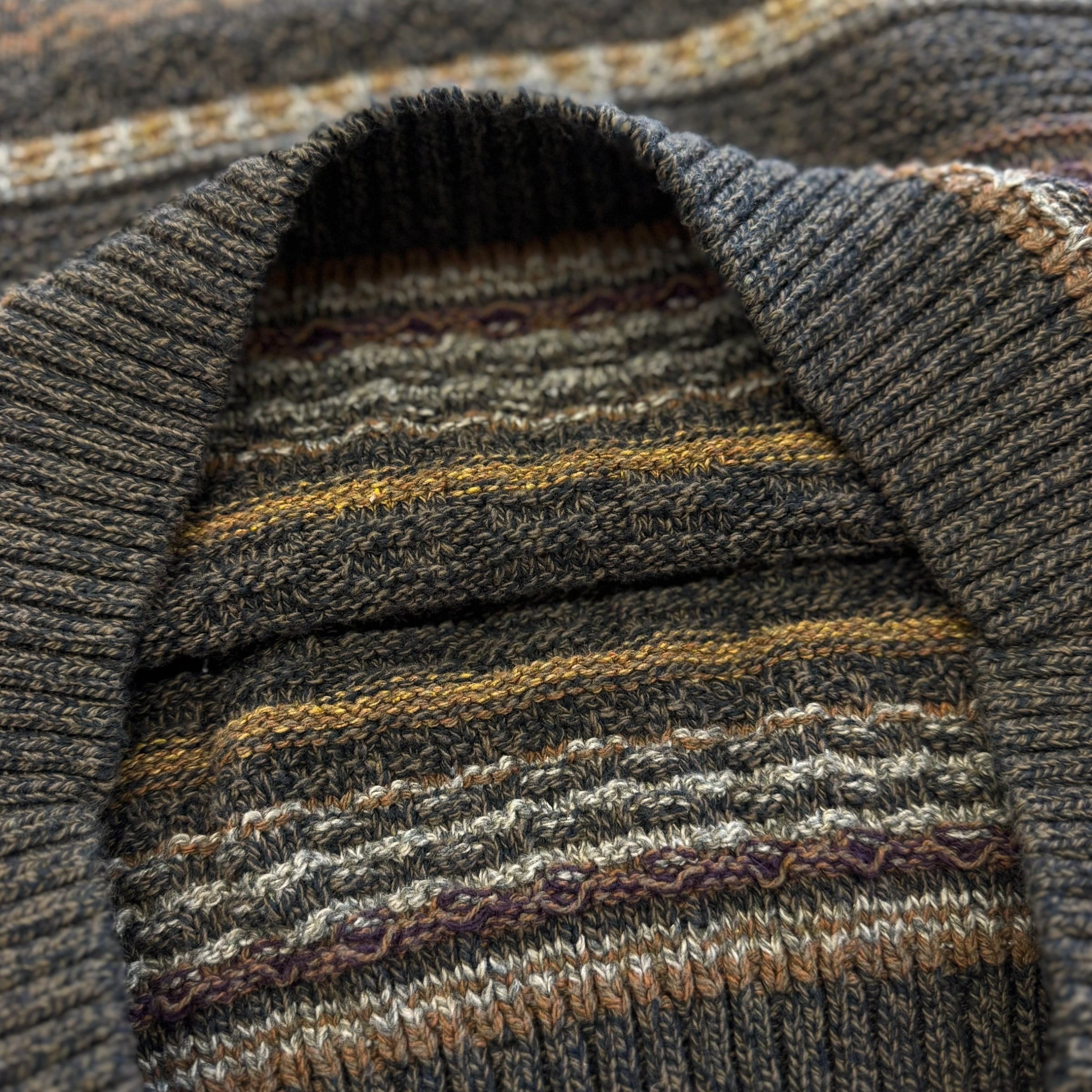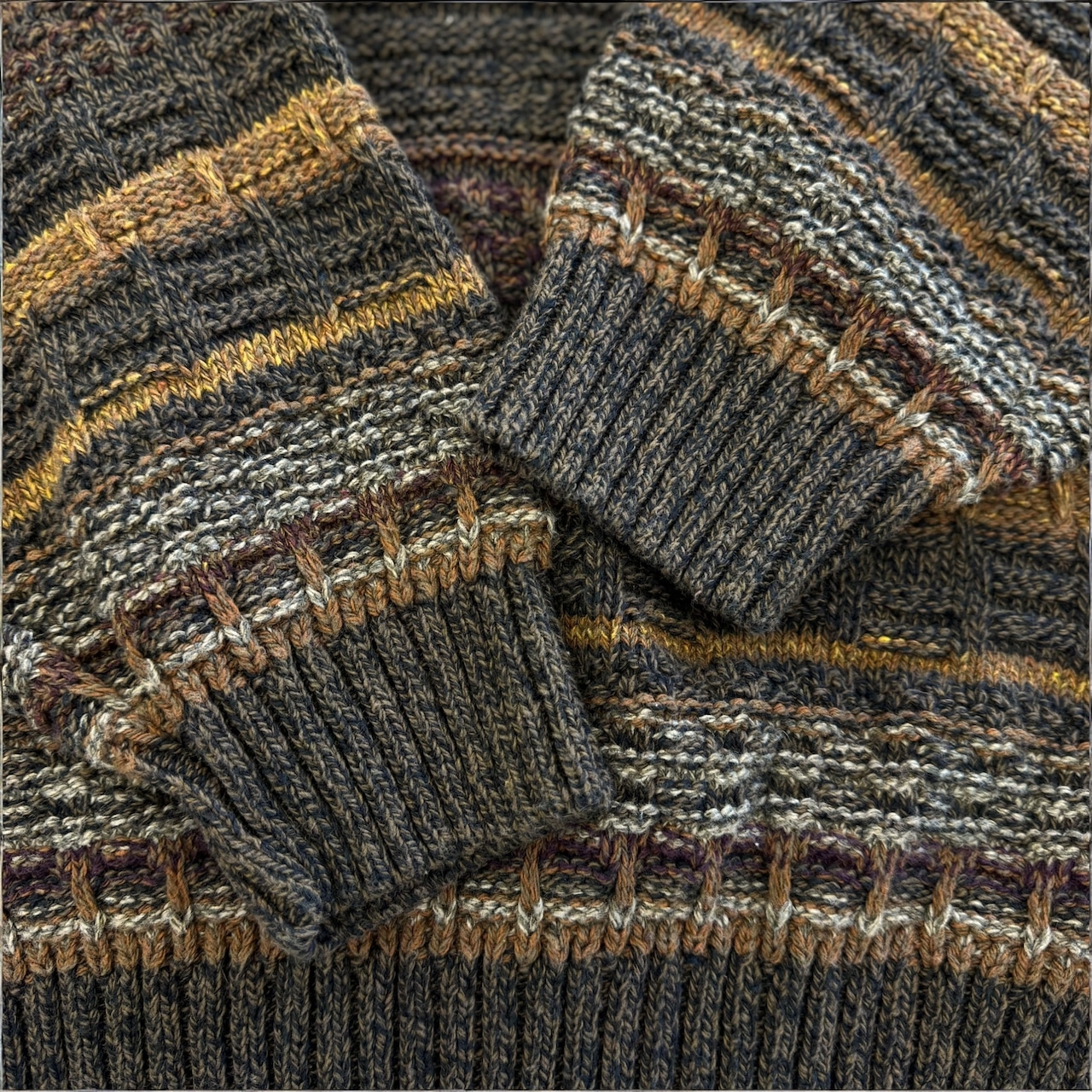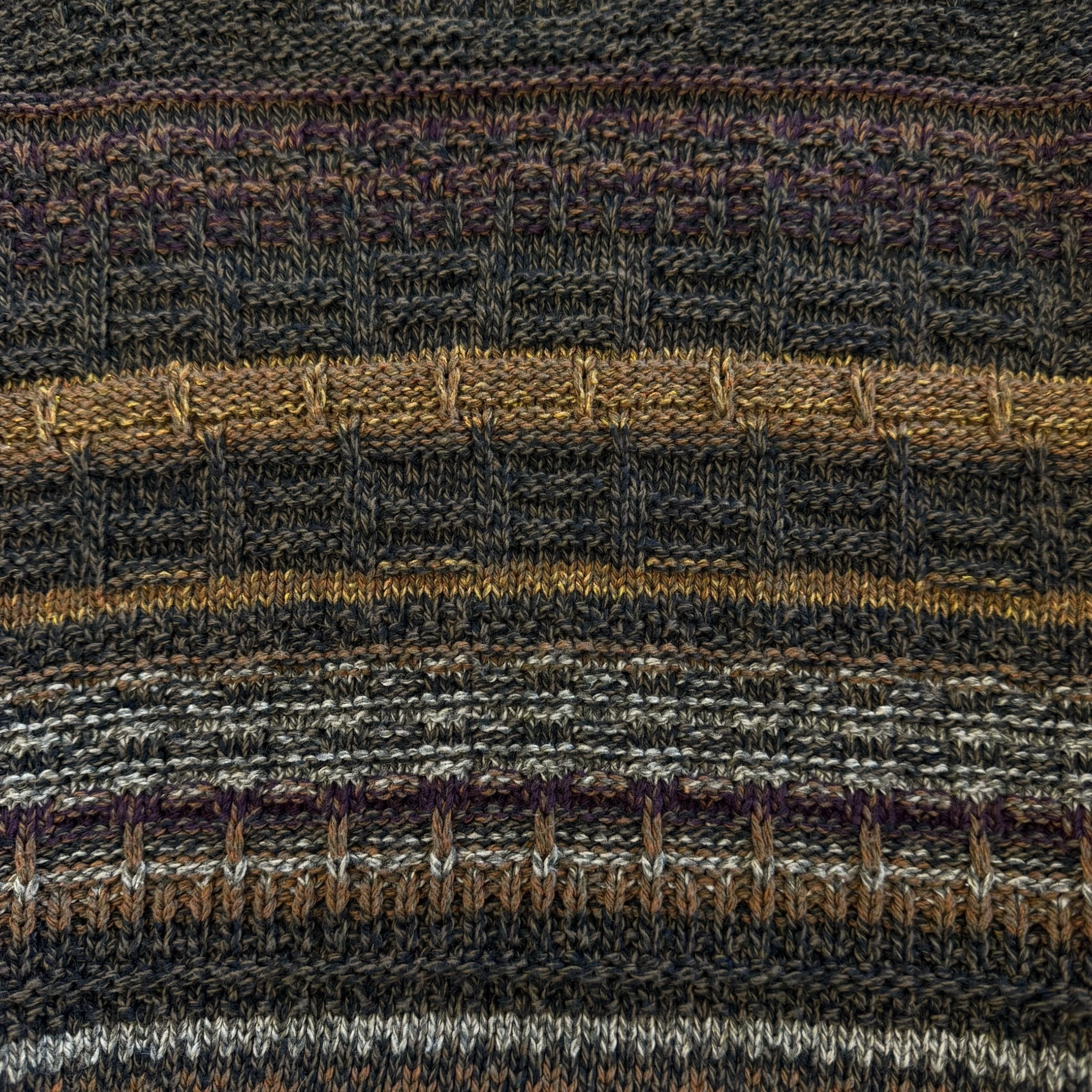 落ち着いたチャコールグレーをベースに、ブラウン、マスタードイエロー、バーガンディ、ホワイトなど多色の糸をミックスし、凹凸のある編み方と、縄目や幾何学模様など複数のパターンを組み合わせたボーダー柄が特徴的。