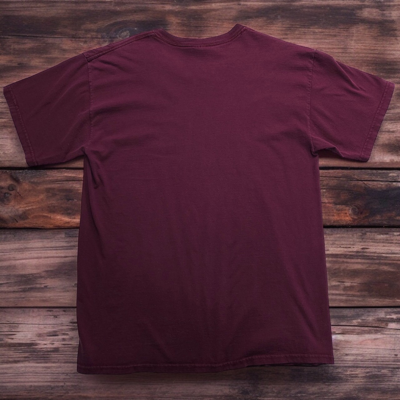 このワインレッドのプリントTシャツは、古着のような雰囲気が漂う一枚。ユニークな「RCMP」の文字プリントが目を引く、おしゃれなデザインです。カジュアルな日常コーディネートにぴったりなアイテムで、Lサイズなのでゆったりとした着心地も魅力的です。色落ち加工が施されたワインレッドカラーは、アンティークな雰囲気を醸し出し、スタイリッシュな印象を与えてくれます。