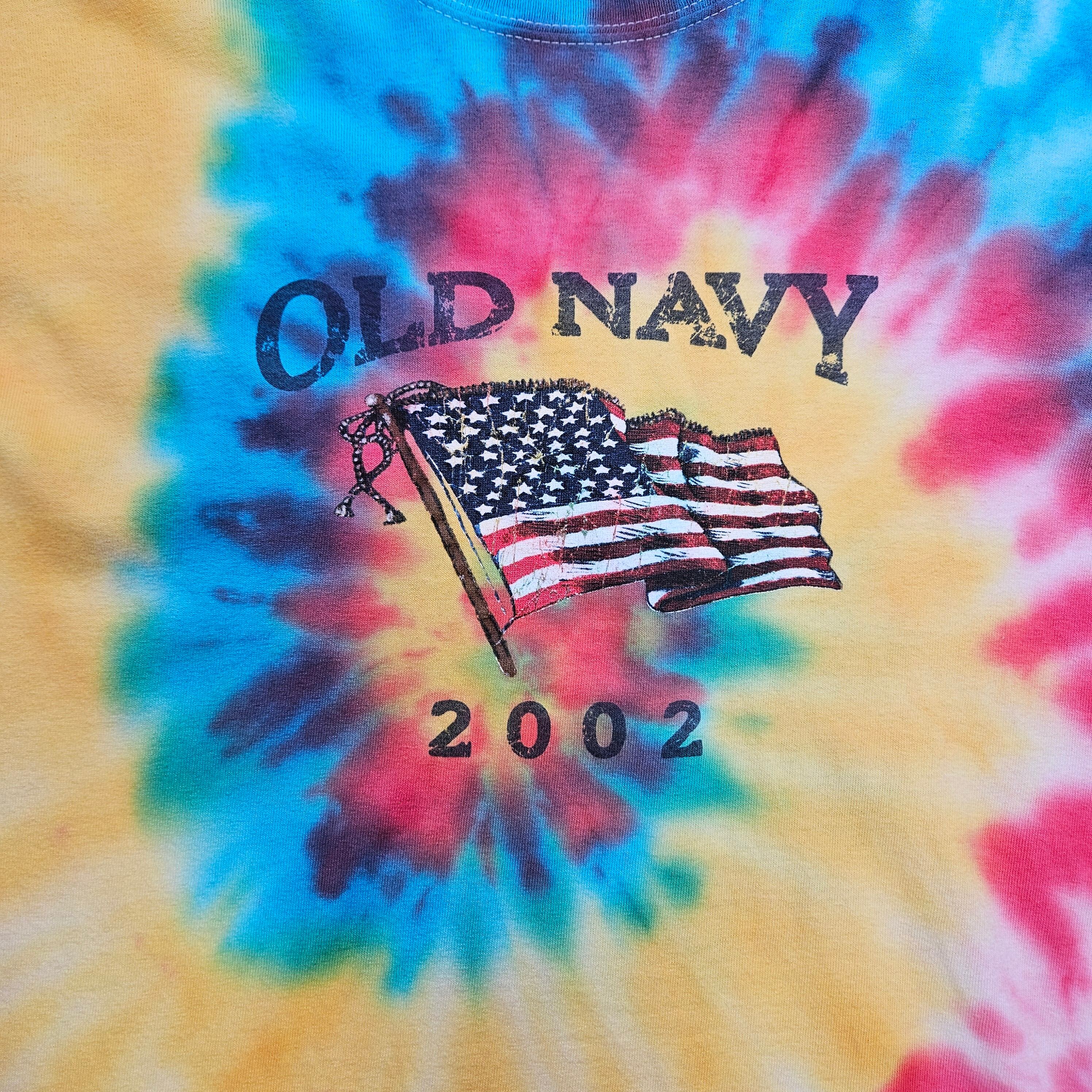 独特なカラーリングが印象的なタイダイ染めTシャツ。古着ならではの風合いと、フロントに施されたアメリカ国旗と"OLD NAVY"のデザインがポイントです。どんなスタイルにもマッチするシンプルなカットと、Sサイズならではのジャストフィット感が魅力を引き立てます。